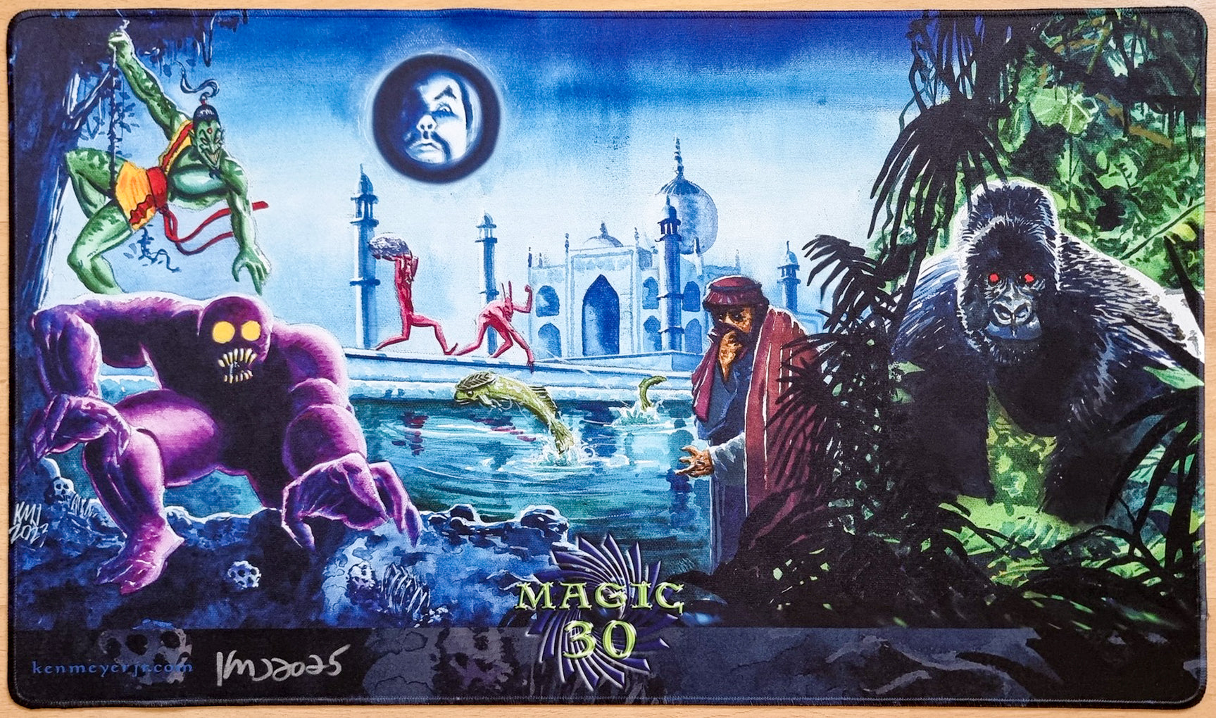 Encargado para el 30º Aniversario de Magic, “Arabian Jungle” es el collage conmemorativo de Ken Meyer Jr. que reúne sus ilustraciones más queridas: una escena nocturna atmosférica enmarcada por palmeras, luz de luna y la silueta inconfundible de un palacio opulento. Una carta de amor a los inicios de Magic y al propio legado de Ken.
