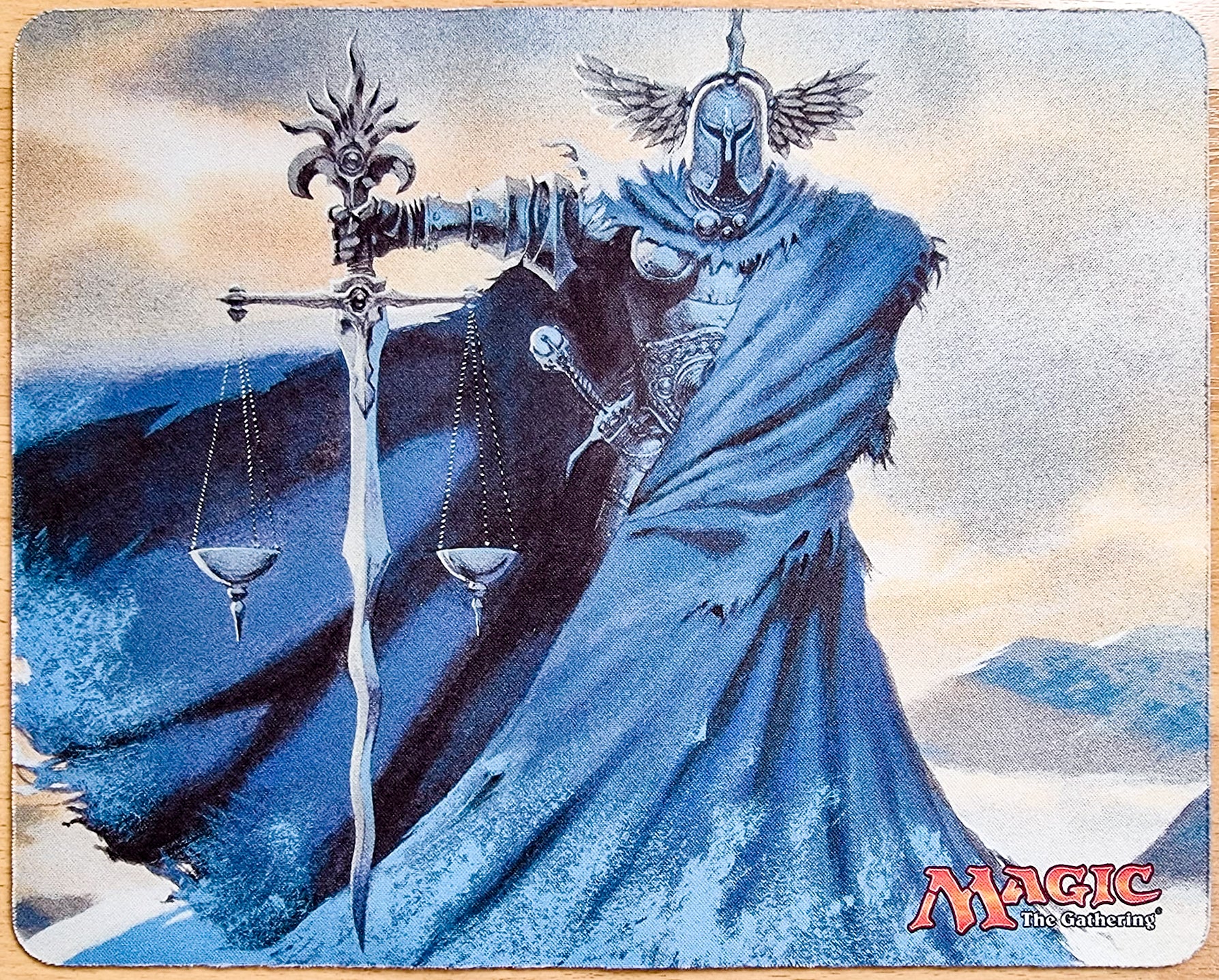 Aplica orden en cada clic y volteo de carta con la inquietante visión de Equilibrio (Balance) ilustrada por Kev Walker. Caballero encapuchado, yelmo alado y espada-balanza: una imagen que sigue definiendo los mazos de control tras dos décadas.