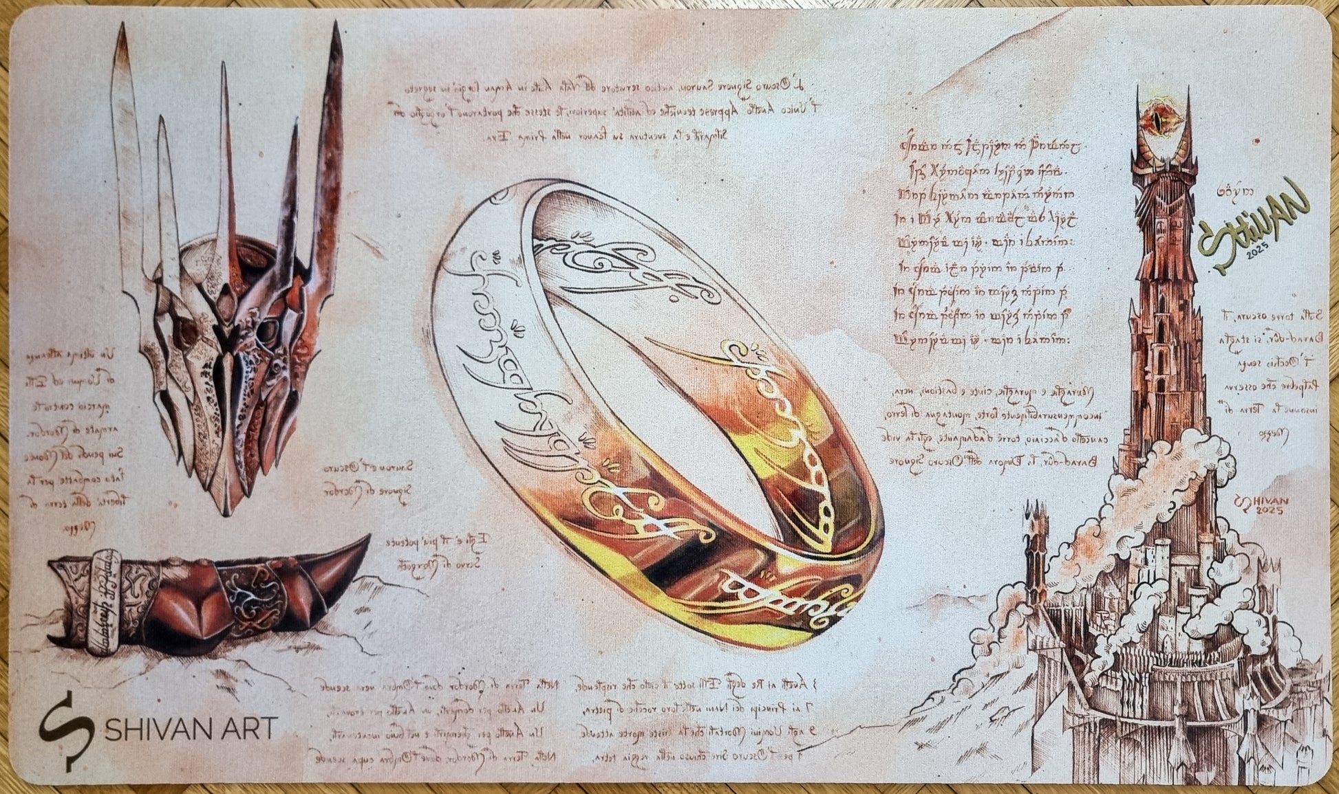 The artwork reimagines Tolkien’s legendary artifact through the lens of Renaissance invention, blending anatomical studies, architectural sketches, and handwritten notes inspired by Leonardo da Vinci’s notebooks.