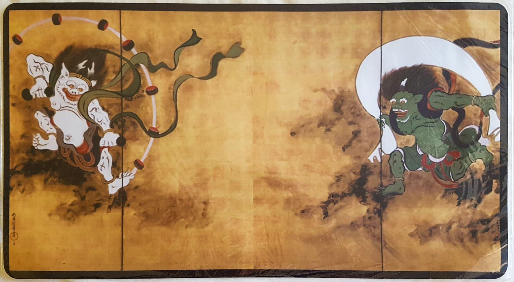Este artículo es un tapete de juego de Magic the Gathering que presenta la famosa pintura del Dios del Viento y el Dios del Trueno del artista japonés Rinpa Ogata Kōrin .