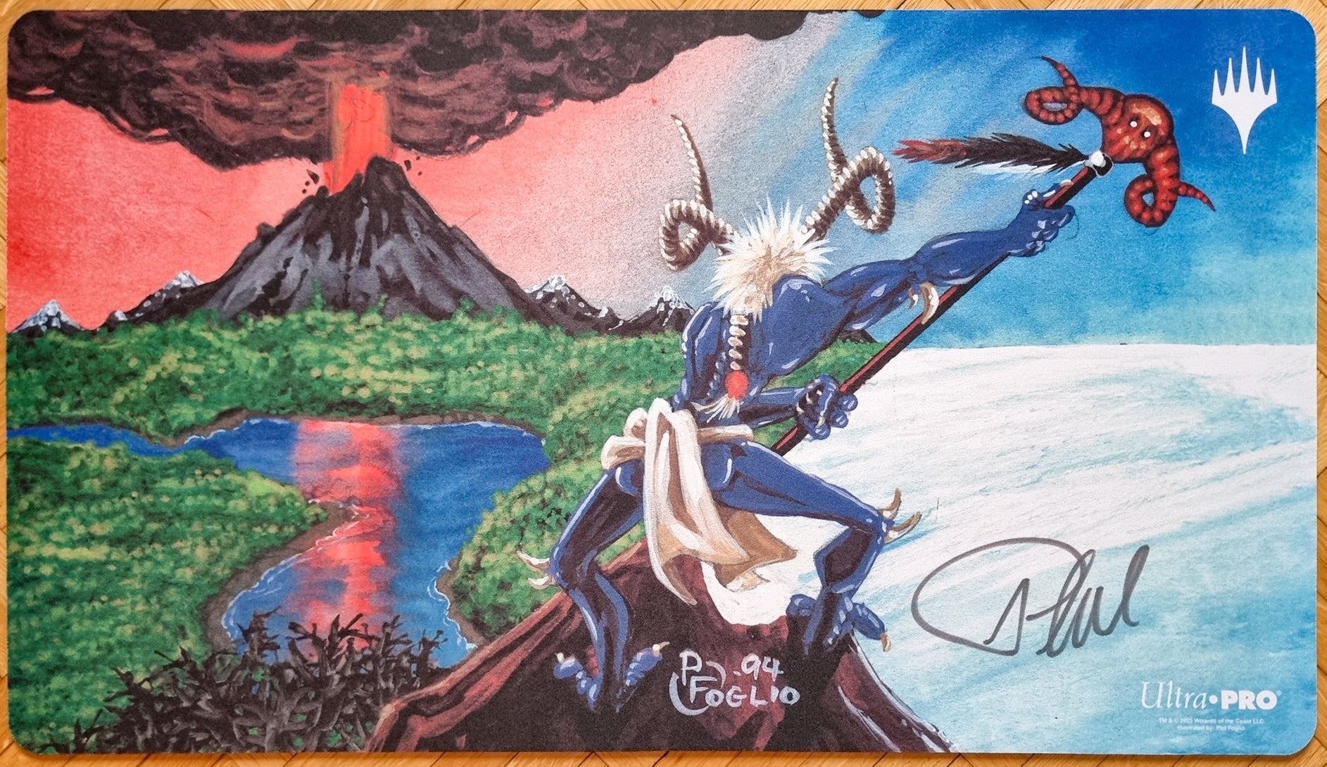 Phil Foglio’s classic Ice Age art erupts across your battlefield—volcanic skies, split realm, and a gleeful devil—all captured in full-mat glory and hand-signed by the legendary cartoonist. ✍️