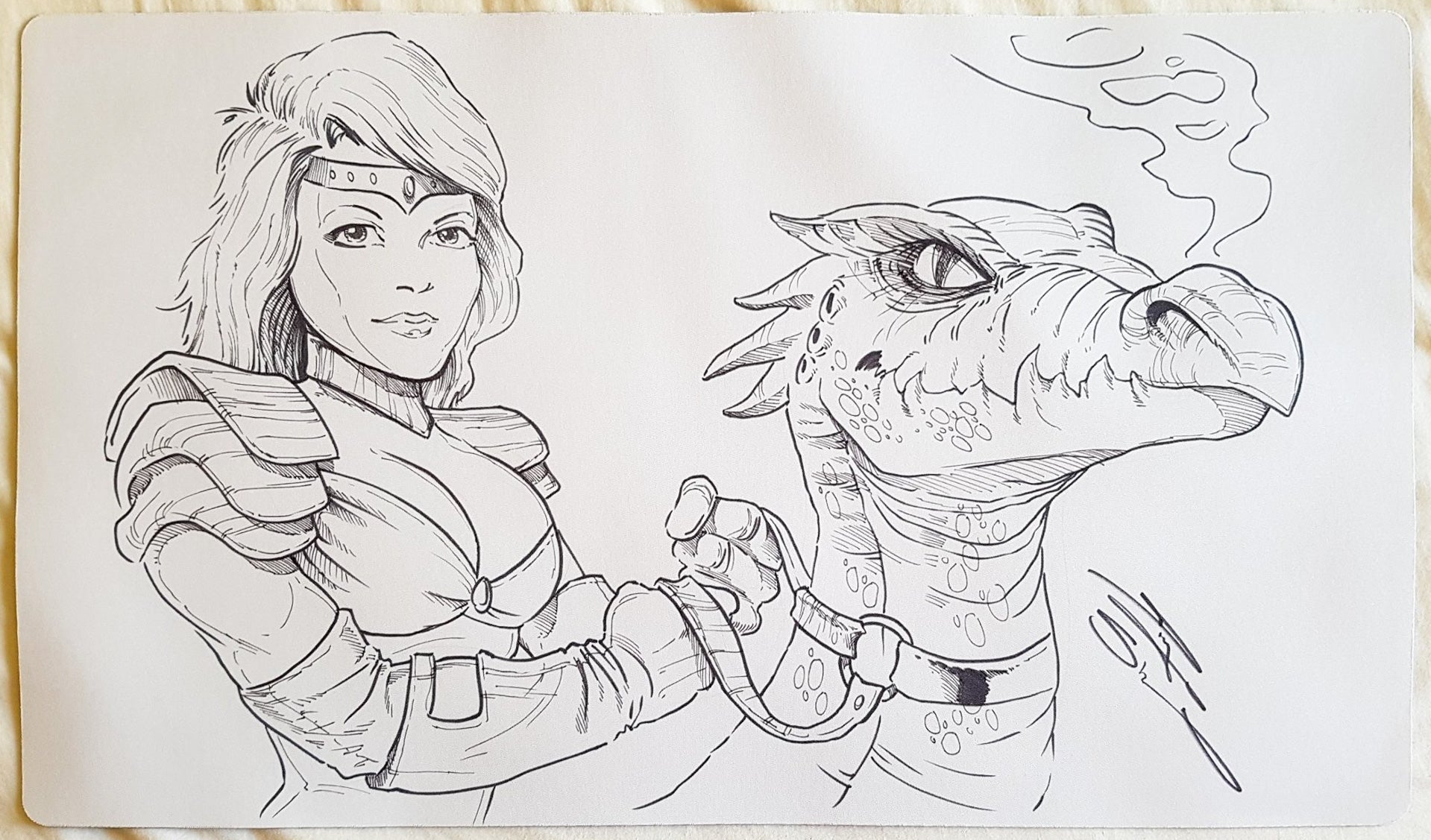 Questo articolo è un tappetino da gioco di Magic the Gathering raffigurante una versione disegnata a mano di Serra che cavalca un drago dall'artista Douglas Shuler .
