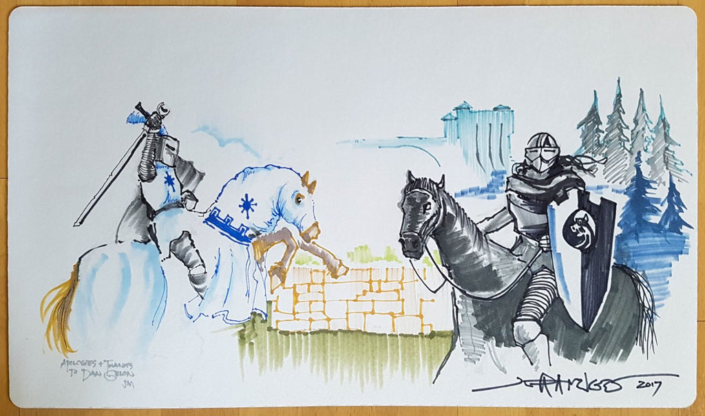 Questo articolo è un tappetino da gioco di Magic the Gathering con un versione disegnata a mano delle opere d'arte di White Knight e Black Knight dell'artista Jeff A. Menges . Menges è l'autore dell'arte del Cavaliere Nero , originariamente presente nella Limited Edition Alpha , e si scusa sul tappetino da gioco per aver disegnato anche il Cavaliere Bianco di Dan Gelon .