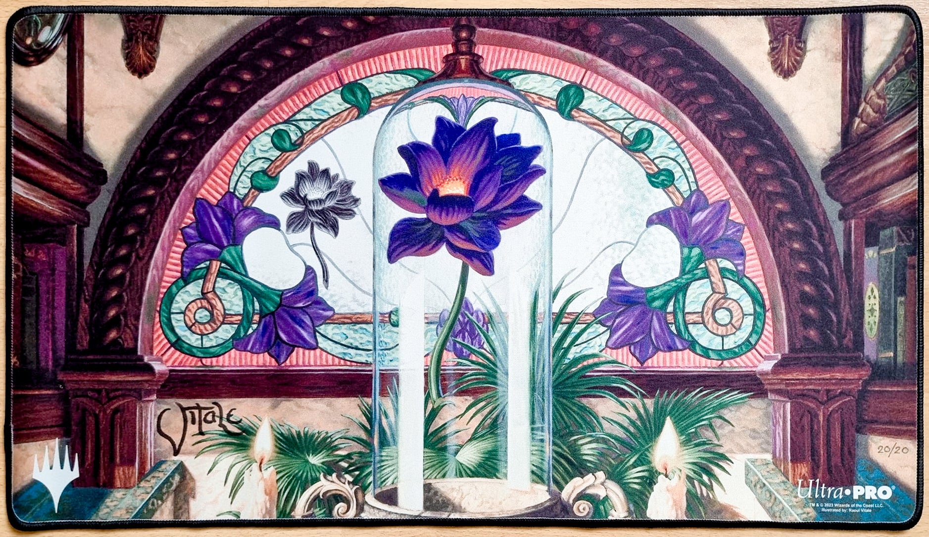 Presenting a highly exclusive Black Lotus playmat, featuring artwork by the renowned artist Raoul Vitale.