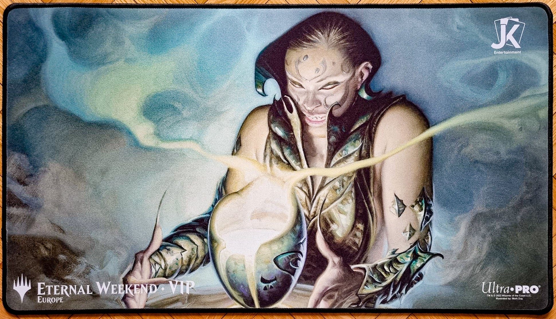 This item is a VIP Magic the Gathering playmat, from the Eternal Weekend Europe 2023, featuring the Chalice of the Void artwork by Mark Zug originally featured in Mirrodin.