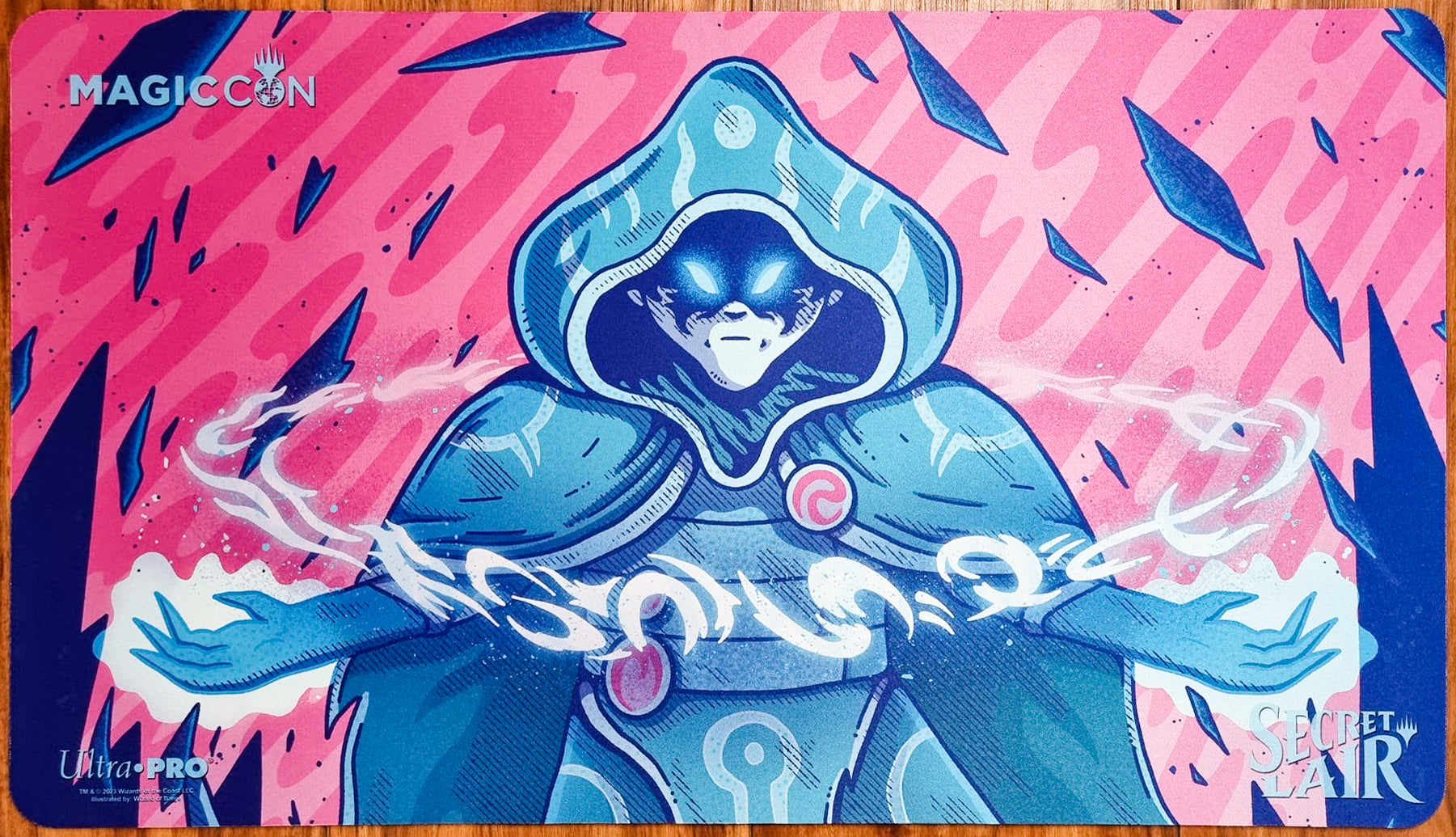 This item is a Magic the Gathering playmat, from the MagicCon Philadelphia 2023, featuring Jace, the Mind Sculptor artwork by Wizard of Barge originally featured as a Secret Lair Drop.
