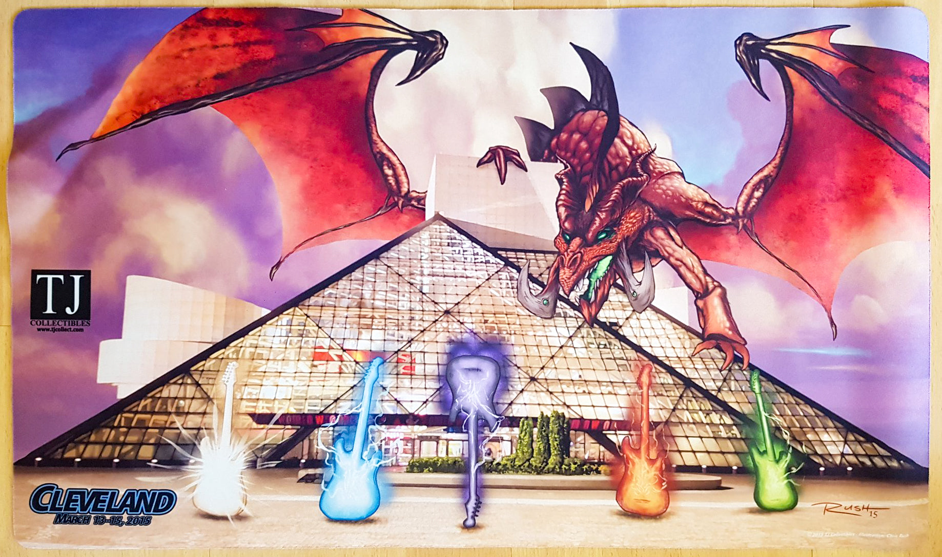 This item is a Magic the Gathering playmat featuring custom artwork for the Grand Prix Cleveland 2015 of the Rock & Roll Hall of Fame and a Dragon by Christopher Rush.